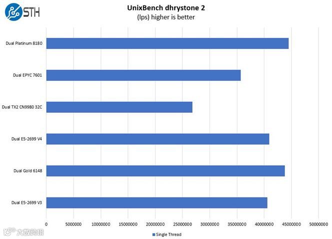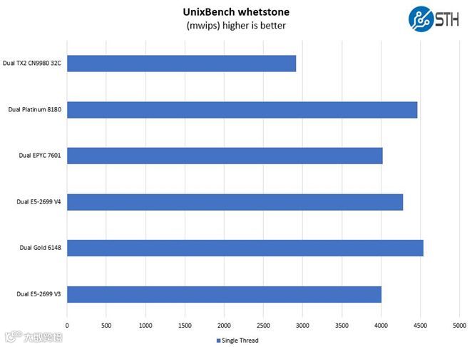 此测试展示了英特尔单核睿频加速(single core turbo boosts)的突出性能表现,同时ThunderX2也提供了颇有竞争力的单线程性能。