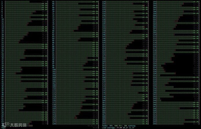 这一测试结果让我们发现了ThunderX2的另一突出优势。256线程数量很多,在64MB缓存时尤其如此,正如在4插槽系统中x86产品支持超过200个线程时的表现一样。有时候我们会发现软件并不支持使用如此多的线程。因此我们进行了额外的测试来观察htop,结果如下: