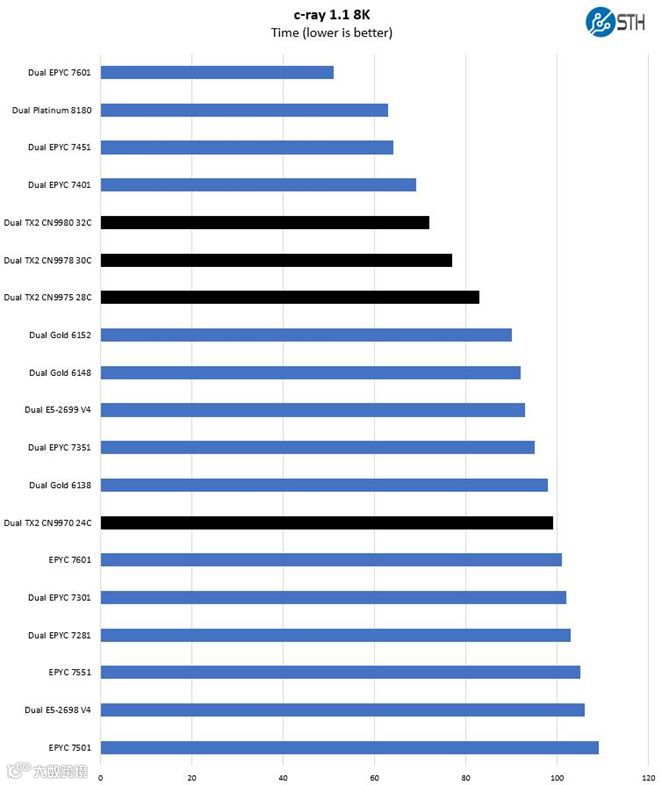 ThunderX2 C Ray 8K基准测试结果对比图