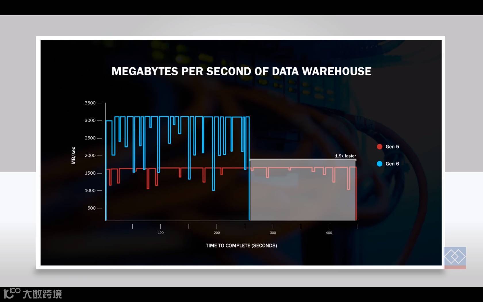 数据仓库查询的测试结果显示,数据挖掘速度最高可提高1.9倍。测试过程中工作负载饱和时,第五代FC组件大多时间会达到单通道线速性能。而在第六代FC HBA和交换机上,相同的工作负载可接近于达到稳定的线速性能,却并未达到饱和。在此情况下,工作的完成时间可减少约一半。可以说,不需要任何服务器或存储投资即可将服务器的带宽提高近一倍,实现了与大规模横向扩展存储技术相同的效果。