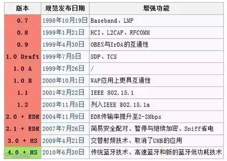 在5.0之前,蓝牙经过了多个版本的演进,主要为1.1、1.2、2.0、2.1、3.0、4.0、4.1和4.2,下面我们挑几个重要版本进行介绍: