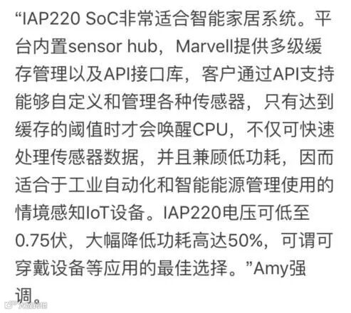 •IAP220内置sensor hub,处理传感器输入不但速度快,耗电量也低,因适合于工业自动化和智能能源管理使用的情境感知(context-aware)IoT设备。通过API支持能够自定义和管理各种传感器,所有I/O模块化管理都独立于处理器之外,以及只在需要传感器输入时才唤醒CPU。