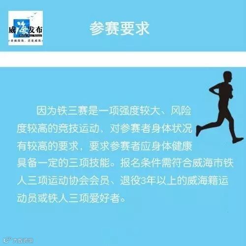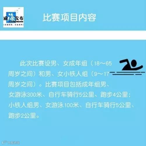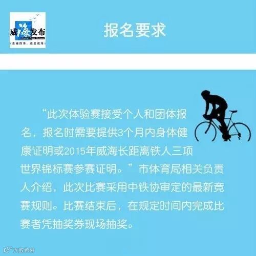 铁人三项趣味体验赛将于21日上午9时到11时举行,比赛地点为威海铁人训练基地。铁人三项爱好者可于18日下午5时前到大成体育文化传播有限公司各自行车连锁店报名,限额200名,报满为止。