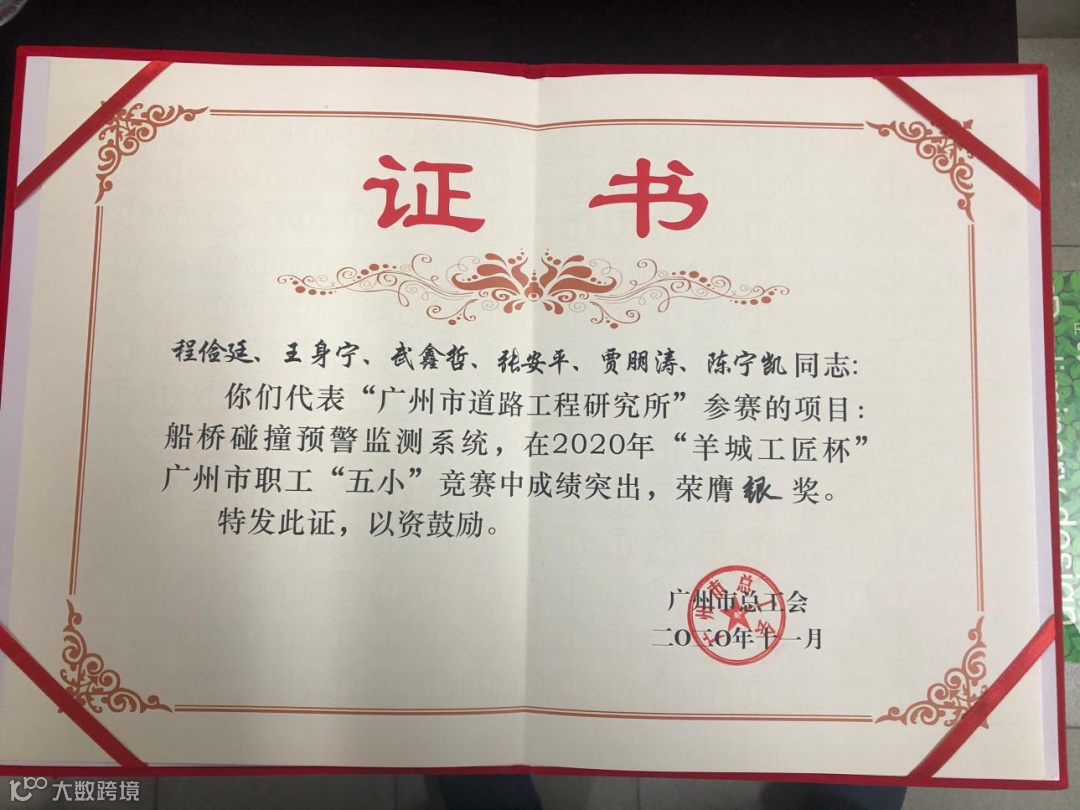广州市道路工程研究所报送的项目“船桥碰撞预警监测系统”荣获银奖。