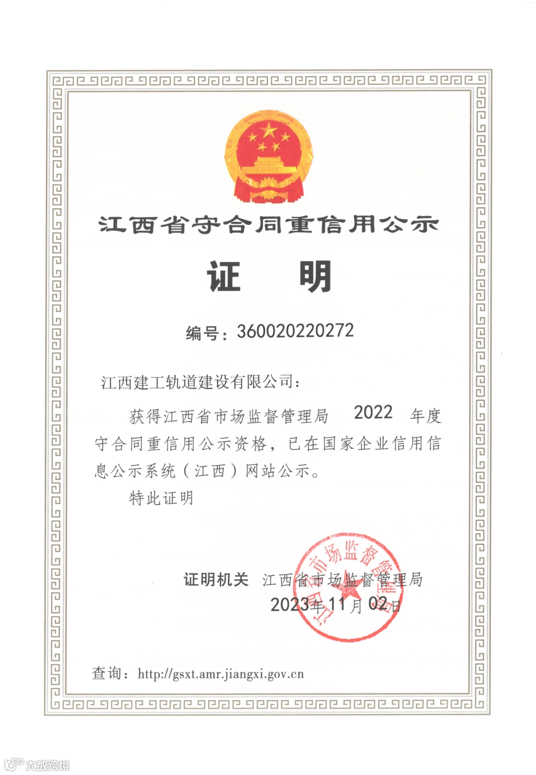 近日,公司获得由江西省市场监督管理局颁发的 “2022年度江西省守合同重信用公示资格”。公司始终秉持诚实守信、依法履约、维护各方权益的宗旨立足于市场,已连续多年获得省守合同重信用公示资格,信誉基础更扎实。