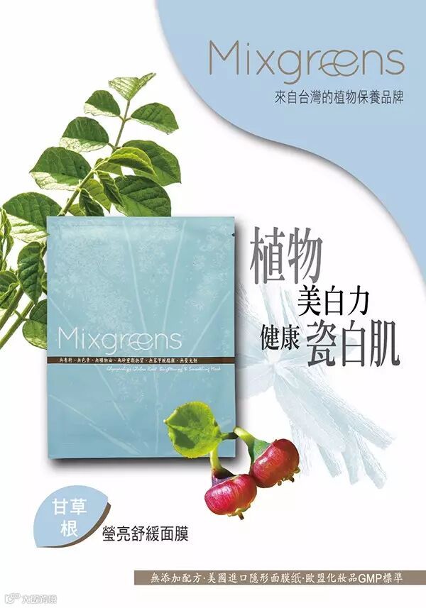 户外晒过之后,脸部肌肤的黑色素活跃。因此,在镇定皮肤和补水过后,您还需要敷美白面膜,抑制黑色素的生长,保持雪白亮泽的肌肤。台湾和草小屋的甘草根莹亮舒缓面膜,8大无添加,7种天然美白成分,从源头抑制黑色素生成,养成健康美白肌,现在买5送1哦~