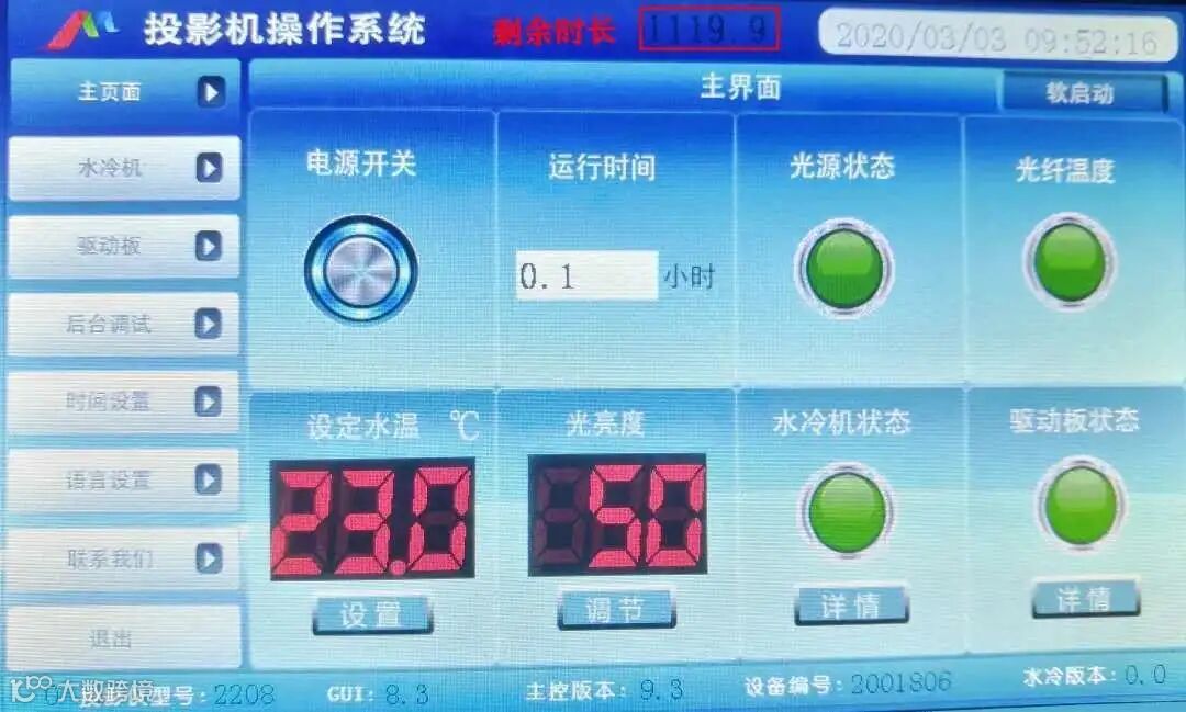 设备开启无异常后,可以开启光源,加载影片进行影片播放。光源开启前,确保水冷机温度正常(排风或者空调正常工作)。