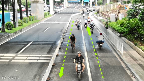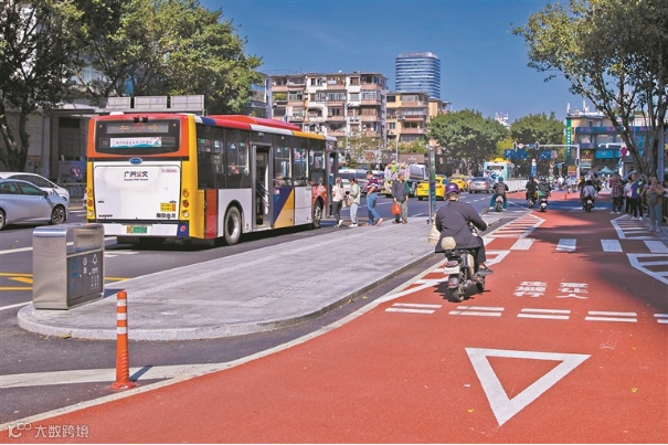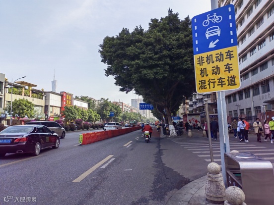 广州首个机动车与非机动车混行车道试点(右侧共享车道 )