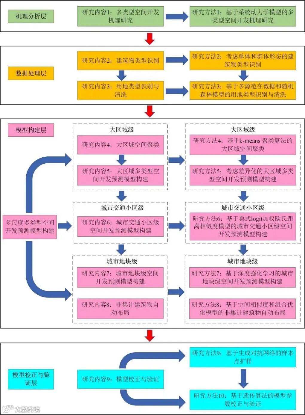 在机理分析层,针对不同的空间开发类型,利用系统动力学模型开展多类型空间开发机理研究。在数据处理层,利用随机森林模型开展建筑物类型识别、用地类型识别与清洗工作。在模型构建层,进行大区域级、城市交通小区级以及城市地块级三个尺度的空间开发预测模型构建。在模型校正与验证层,利用生成对抗网络进行数据扩样,同时利用遗传算法进行模型的参数校正与验证。本研究旨在为区域和城市规划、交通规划提供决策支持。