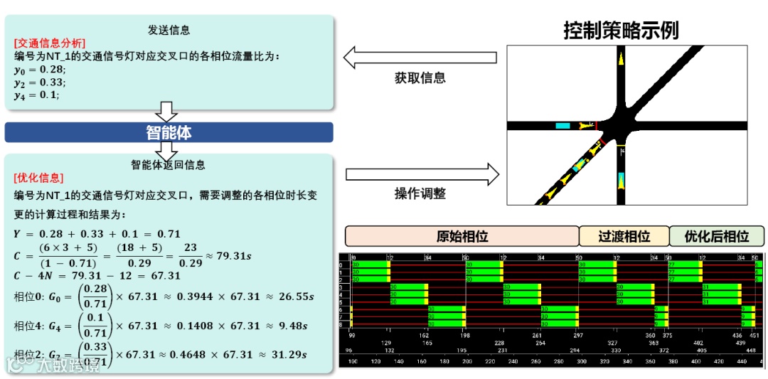 本项目在实现层面构建“环境—智能体—策略库”的协同控制。交叉口持续输出交通流、排队、饱和度等状态信息,智能体对多源数据进行语义级理解与特征压缩,在无需复杂数据预处理的情况下完成状态识别与决策推理。
