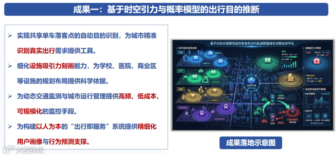 在大数据挖掘方面,项目以无桩共享单车轨迹数据为实证对象,针对开放环境下短途出行活动识别困难以及设施吸引力量化不足等关键问题,构建了改进的引力模型体系,以弥补传统引力模型过度强调距离衰减、忽视设施规模差异的不足,从而提升出行活动的识别精度。