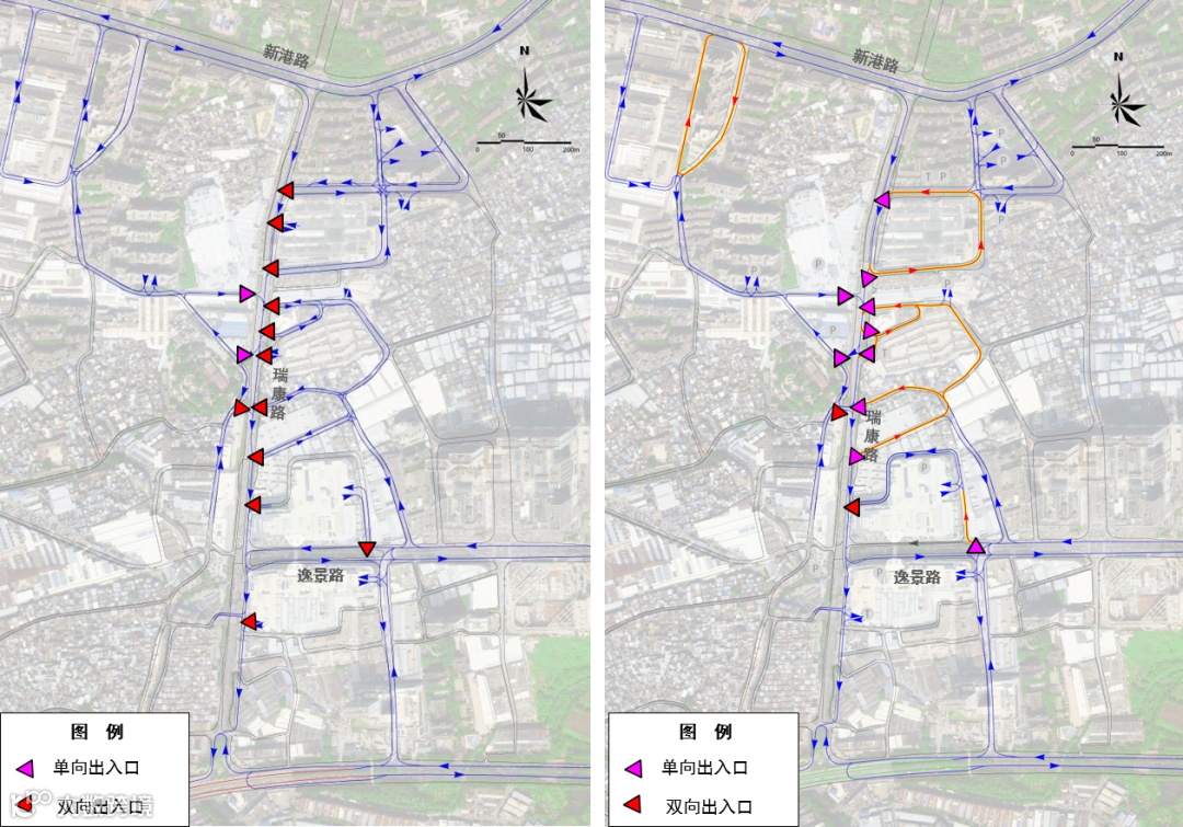 瑞康路、逸景路等主要疏散通道布置过多商场出入口和次支路出入口,大小汽车、电动车、各类货车等大量的机动车频发进出,导致路段的通行效率低,各时段均易导致交通拥堵。通过利用单向交通组织和调整商场进出交通组织,减少出入口双向进出的交通干扰,减缓对路段的主线的干扰,同时强化内部交通组织循环,改善内部交通秩序,从而缓解干道交通压力。