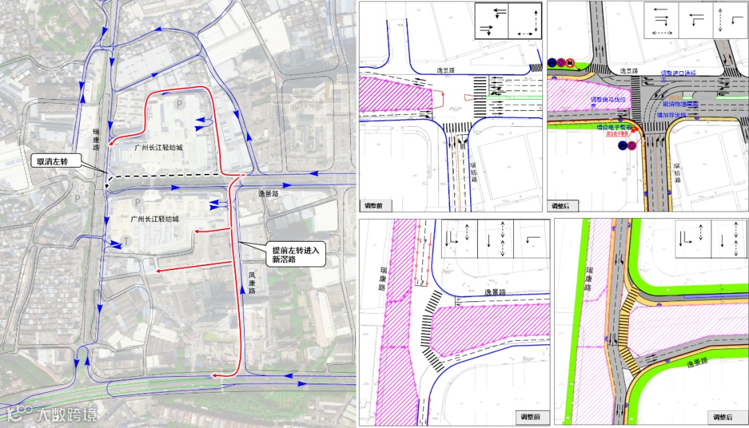 干道瑞康路和逸景路交叉口是是中大批发市场主要的拥堵点,高峰时段由于电动车、机动车、人行相互交织严重,导致交叉口进口道高德平台拥堵指数超过了5,运行速度仅为5km/h,交通拥堵严重。调整交通组织,减少交叉口进口道车流,从而减少冲突点,保证主线车流,同时优化信号配时、标志标线及新增相应的配套标识标牌等,通过空间换取时间,保证通行秩序和效率。