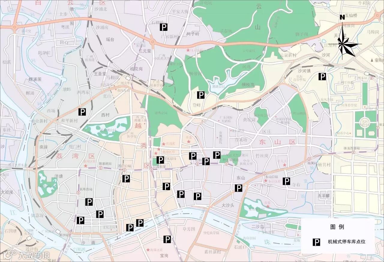 根据目前的广州机械立体停车设施规划,在用地最为紧缺的中心城区共规划有20个专门的各类机械立体停车点位,泊位3000个,涉及用地总面积约2.4万平方米。各行政区机械式立体停车库规划点位数量及泊位规模情况如表1所示,点位分布状况如图9所示。