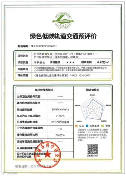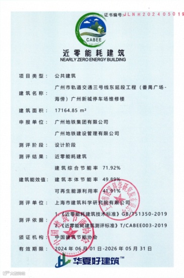 广州新城停车场采用高性能维护系统、高效冷热源系统、太阳能光伏系统、能源管理系统措施,实现绿色三星建筑标准,成为全国首个绿建三星轨道交通车辆基地和全国首个近零能耗轨道交通车辆基地建筑,推动了绿色低碳轨道交通行业发展,助力实现双碳目标。