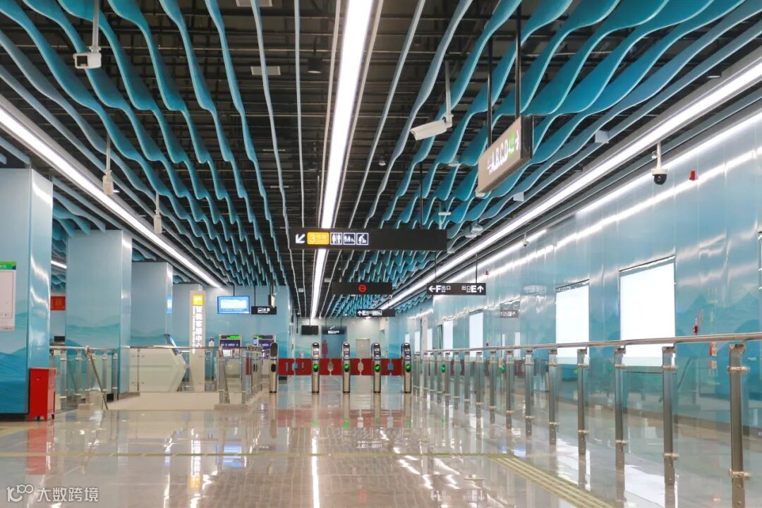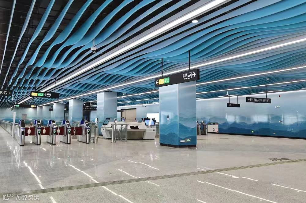海傍站以“逐水傍海”为设计主题,以海的蓝色贯穿整个车站,渐变色的波浪型垂片,高低起伏的天花造型,犹如波光粼粼的海面和潮起潮落的浪花,墙面的搪瓷钢板增添国风水彩波浪图案,地面通过拼花石材营造“海傍”的氛围,为乘客带来浓郁的沙田水乡风情视觉体验。