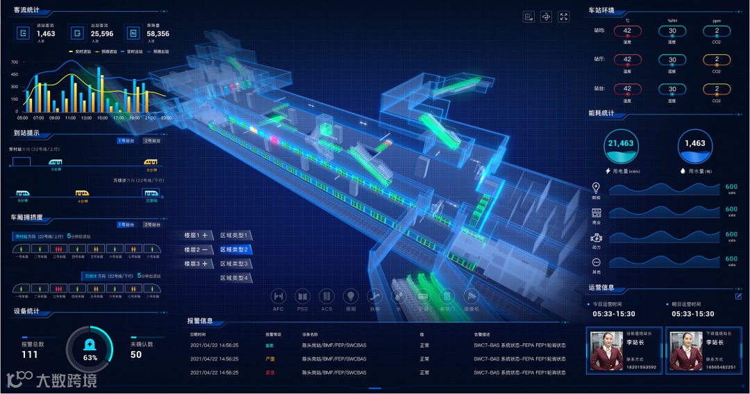 在调度指挥方面,利用大屏可视化技术,实时监控客流变化、列车运行和实时在线监测设备运行状态,做到“情况看得见”、“指令听得到”、“位置找得到”的可视化指挥调度;在车站管理方面,实现一键开关站、自动巡站等功能,将车站“人、机、环”全方位动态智能感知;