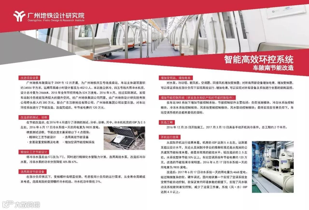 针对几个能源消耗较大的系统,我院进行了深入的研究分析。其中空调系统方面,其主要耗能设备包括风机、空调器冷水机组、水泵和冷却塔等。因此,空调系统节能方面,首先提高各设备的能效限定值要求,其次,针对主要的大功率设备新增变频器进行变频控制,对空调水系统进行工艺节能设计以及精细化节能设计,采用高效冷水机组,安装节能控制系统等节能措施。以2016年的车陂南环控系统改造项目为例,我院在该改造项目上投入300多万元研发了节能控制系统,于2017年3月中完工投入运行,到今天已经运行了约半年的时间,从运营反馈来看,不但车站环境改善了,在大系统空调冷负荷有40%左右的提高的前提下,全年节电150万度左右,节能50%以上。全年冷站COP可以达到5.5左右,处于国内领先水平,达到国际先进水平。若将该节能技术应用在新线建设当中,预计每条线年均可节约电费约1500万元。