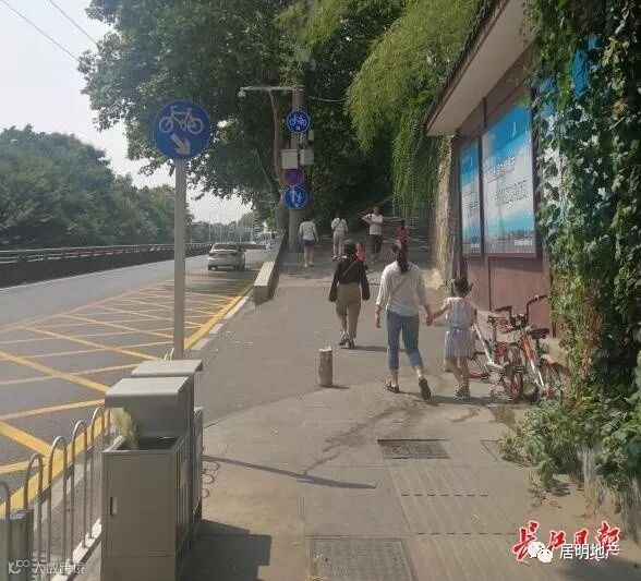 随后,长江日报记者又来到长江二桥汉口上桥处发现,上桥楼梯设置了围栏限制自行车进入,周边也布满了禁止自行车上桥的标识,两侧约1.5米宽的人行道只允许步行。