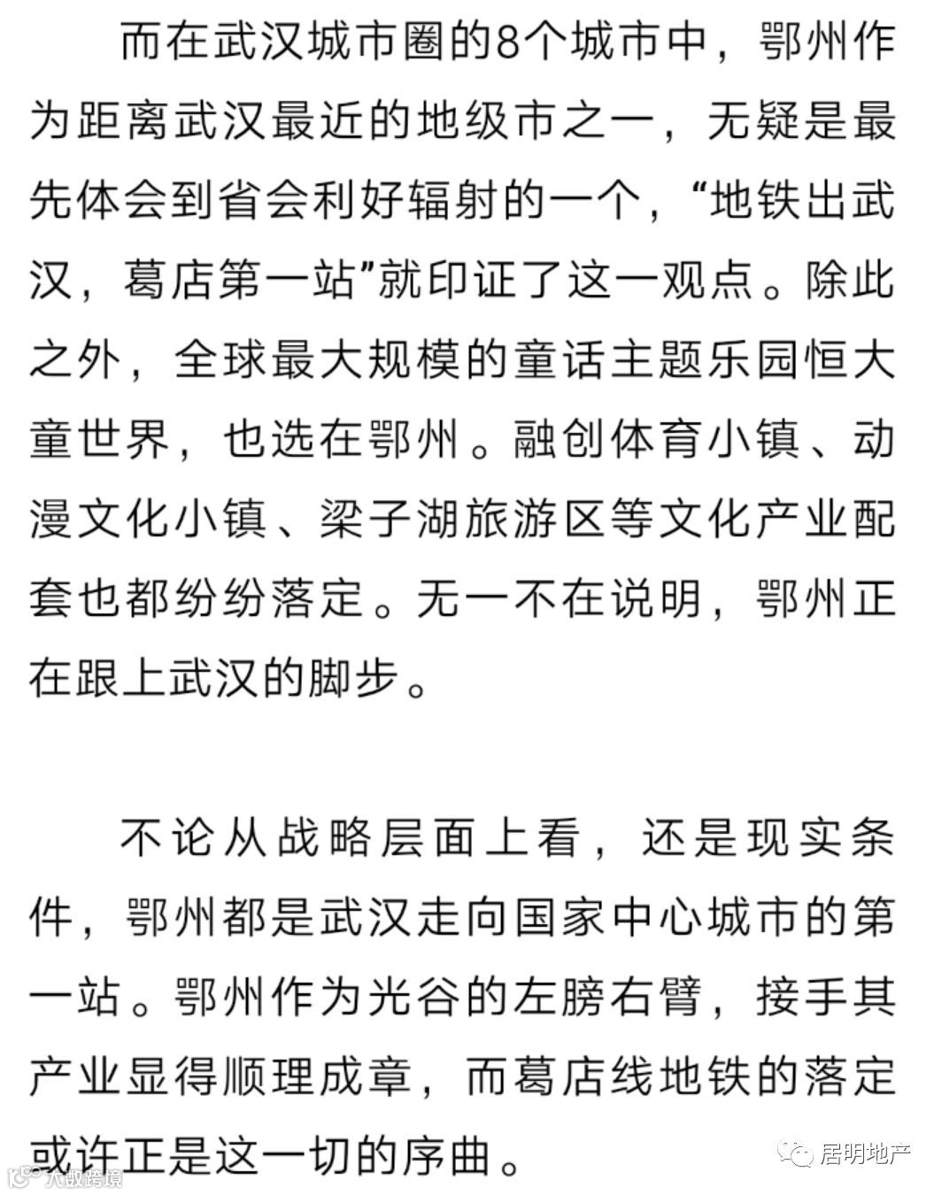 鄂州受到房企的青睐与自身天然带优势的地理位置不无关系。作为武汉市独树一帜的高新技术产业中心——光谷,汇集了众多高精尖技术人才、高新技术产业,成为武汉经济发展的领头羊。而鄂州到光谷的距离甚至要比汉口到光谷的距离还要近,这就为以后外溢的就业人口提供了一个出口,毕竟往西走的房价跟往东走没有可比性,大部分刚需受房价限制将会外溢至鄂州葛店,甚至更远。