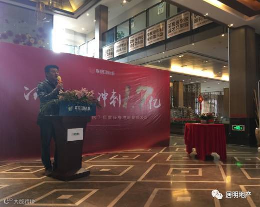 首先,居明公司黄冈项目营销总监孙总上台发言,对过去10个月的工作成就进行总结,2017年,我们第一次突破月度4000万销售目标,第一次突破月度7000万销售目标,第一次突破月度8000万销售目标,更是完成月破100套的骄人成绩,并以此激励大家同甘共苦、携手同心共同完成2017年最后60天1.7亿的销售目标!