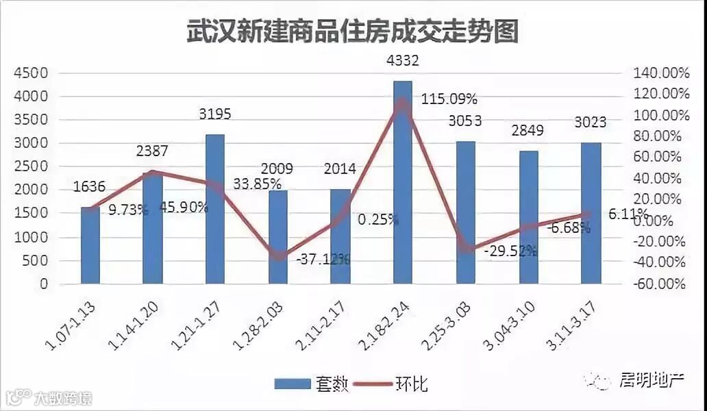 3月第二周,武汉新房商品房成交出现微涨。上周(3月11日-3月17日)武汉新建商品房成交3590套,总面积约37.9万方,环比分别上涨4.15%、7.04%,其中新建商品住房成交3023套,成交总面积约33.68万方,环比分别上涨6.11%、8.23%。