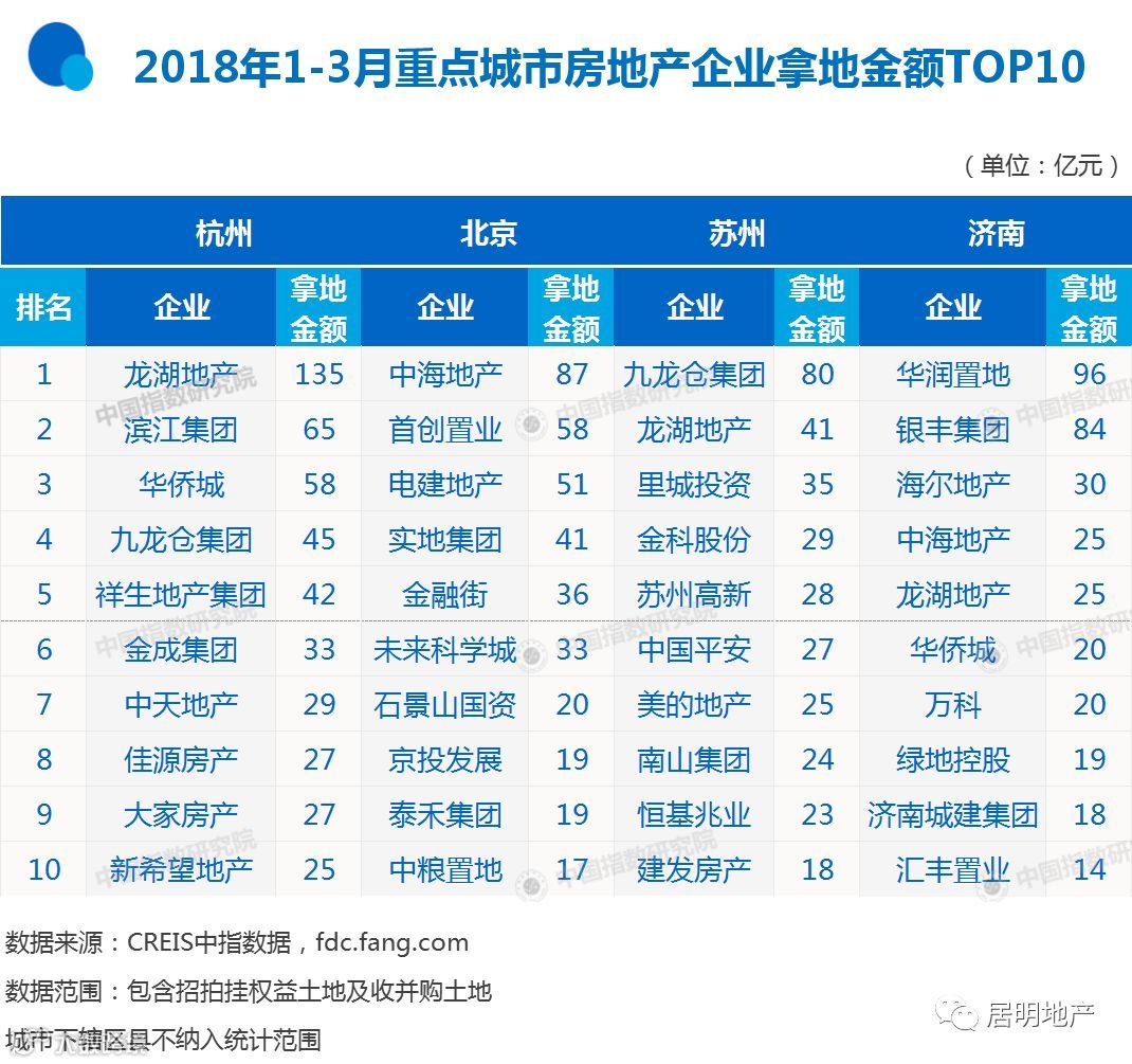 从重点城市拿地金额前十房企来看,资源集聚性日益增加。龙湖深耕成渝多年,城市布局以长三角、环渤海为主,1-3月拿地总额分别出现在杭州、苏州和济南三城前十榜中,其长三角、环渤海布局意图明显。其中,龙湖1-3月位列杭州拿地榜榜首,一方面得益于杭州2018年来积极推地;另一方面,龙湖2017年全年销售额中,杭州以超过200亿元的销售额成为龙湖贡献最大城市,良好的销售业绩,也促使龙湖积极在杭州拿地补仓。同时,九龙仓1-3月拿地总额也分别出现在杭州和苏州两城前十榜中。九龙仓2017年年度业绩会上,明确指出2018年拿地重点布局城市将集中到6个,其中就包括苏州和杭州两城市。同时出现在两城市拿地金额前十榜的房企还包括中海和华侨城,其中,中海以87亿元拿地总额摘得北京拿地榜榜首。