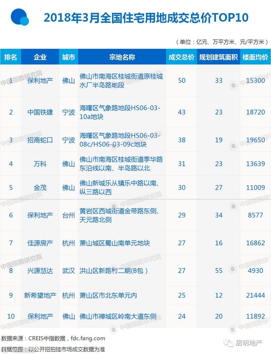 从3月全国住宅用地成交总价TOP10的拿地房企来看,主要为国有企业和大型房企。保利、万科、中铁建拿地积极,其中,保利拿下佛山南海区和禅城区两宗地块,台州黄岩区一宗地块;中铁建43亿元拿下宁波海曙区地块。