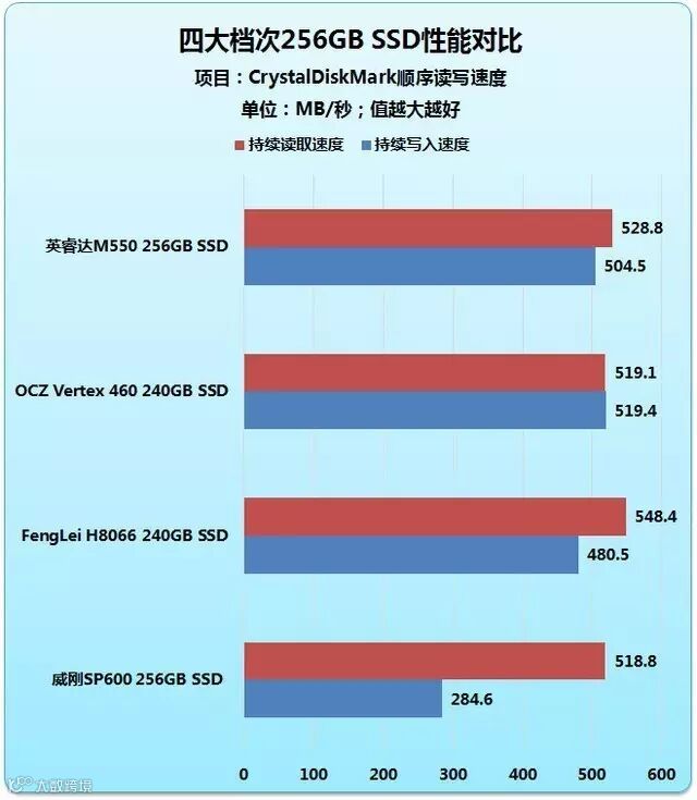 旗舰级的英睿达M550、高端的OCZ Vertex 460的顺序读写速度双双超过500MB/秒,差距不大。采用单核RISC架构/SM2246EN主控的FengLei H8066写入速度稍逊,采用小体积(同为55nm工艺)、低成本的单核ARM架构/JMF667H的威刚SP600的写入速度则显示出入门级SSD的局限性。