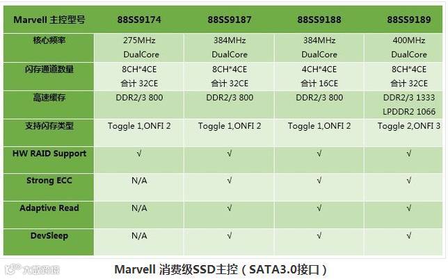 助美光M4一战成名的Marvell 88SS9174主控,从上叙表格来看,已是性能最弱的主控。上市近两年的Marvell 88SS9187主控至今仍用在浦科特M6PRO(旗舰级);而Marvell 88SS9188主控,则用在浦科特M6S(中高端),Marvell性能更优的88SS9189主控则用在美光.英睿达M550(旗舰级)。