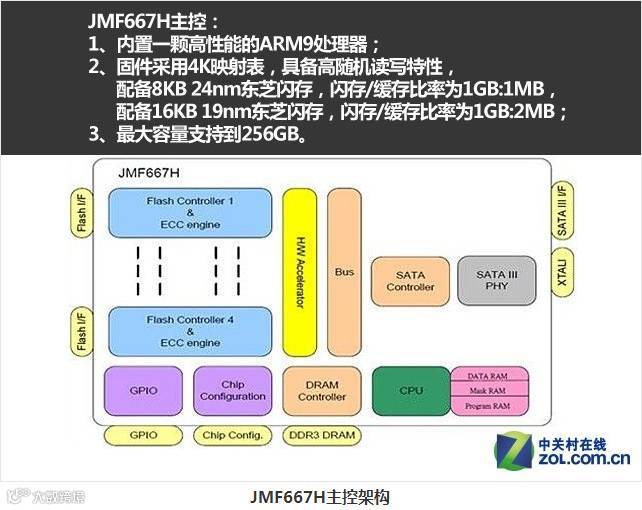 JMF667H和SM2246EN具有相似的一面,不过架构上的不同,RISC架构的SM2246EN拥有更强的运算能力,JMF667H的性能难敌SM2246EN。上市近2年时间的JMF667H主控显示出疲态,今年将有更新的JMF670系列主控来接替它。