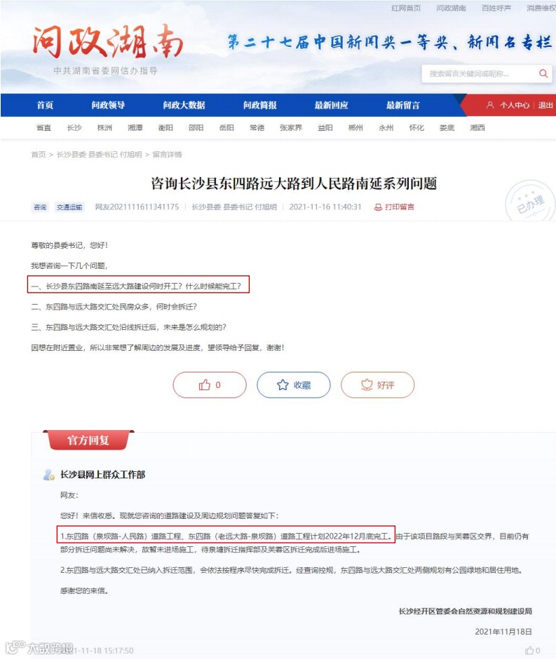 去年有网友在问政湖南留言咨询东四路南延至人民路的进程,官方给了明确的答复,计划2022年12月底完工。也就意味着今年底,雅居乐业主从东四路到6号线韶光站仅1公里多的距离。