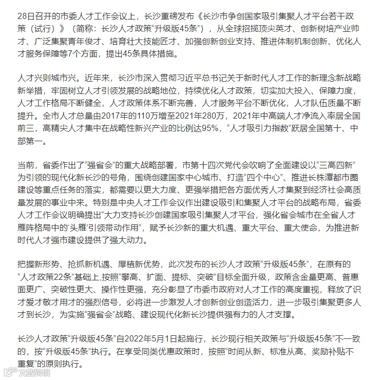 昨天(2022年4月28日),长沙市委人才工作会议发布《长沙市争创国家吸引集聚人才平台若干政策(试行)》,推出长沙人才政策“升级版45条”。