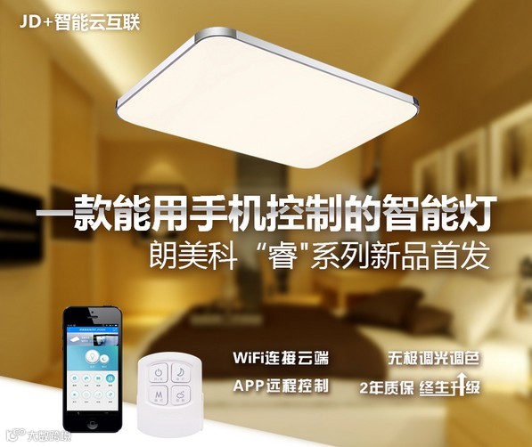 朗美科智能吸顶灯采用专利IC恒流电源,进口高效LED灯珠。可通过Wi-Fi来实现手机APP或遥控器双操控调节灯光亮度和颜色,并可通过手机APP自由设定四种主题场景和延时关灯等功能。