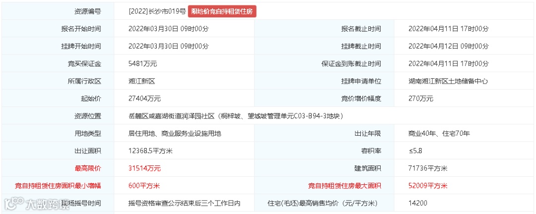 如:【长沙市019地块位】位于岳麓区咸嘉湖街道,北侧为咸嘉湖路、南侧为枫林路,属于河西老城区范围。该地块出让面积12368㎡,容积率5.8,限价14200元一平,周边配套醇熟,环境优越。