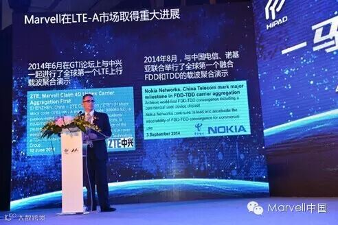 Marvell全球副总裁兼移动及物联网事业部总经理Philip Poulidis在本次发布会上就表达了Marvell将长期投入4G终端产业的承诺和决心,并介绍了Marvell于2014年6月和8月先后与中兴通讯一起进行了全球第一个LTE上行载波聚合演示、与中国电信和诺基亚网络联合举行了做全球第一个个融合FDD和TDD载波聚合演示,以此彰显Marvell在LTE技术领域的领先地位。