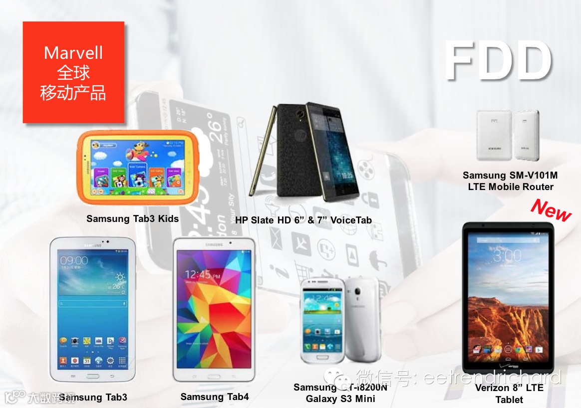 在全球,很多款平板也采用Marvell的方案,卖的最好的是三星的GALAXY Tab3,出货量超过了2000万。另外一个GALAXY MINI卖得很好。Verizon8寸的LTE是基于PXA1920。三星在欧洲也做了一个MiFi路由器,做得非常薄、非常精致。