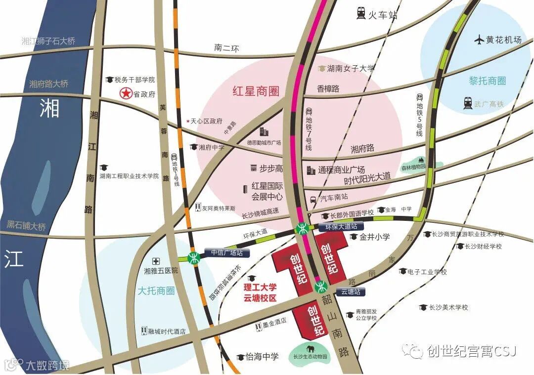精科创世纪广场(创世纪三期·宫寓)紧邻长沙理工大学东南侧,近40000师生的繁华腹地。邻近城际轻轨和地铁5号线,地铁7号线云塘站就在家楼下,交通十分畅达。项目配有逾 7万㎡全临街商业,700多米的商业临街面,汇聚时尚商业、高档行政公馆、精品宫寓,将区域中心商业、创业型商务、娱乐文化、时尚生活集于一体!