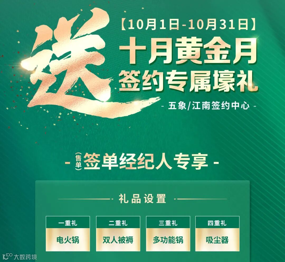 优居交易中心举办“十月黄金月 送签约专属壕礼"活动,为签单经纪人提供赢得专享壕礼的机会。