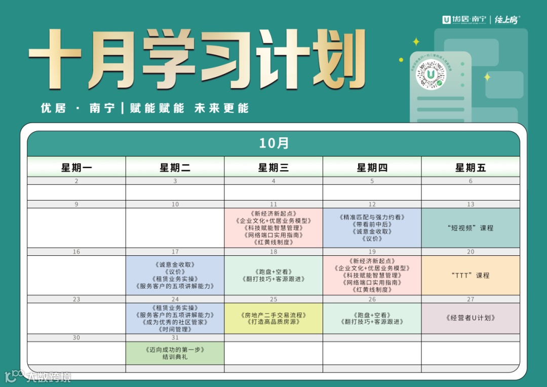 十一月,优居·南宁锚定高质量发展目标,聚焦新课程,谋求新发展,激发新增长,深耕细研,助推门店经纪人及经理掌握更多房产知识技能,努力谱写优居·南宁赋能培训的新篇章!