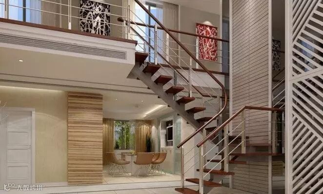 主要是考虑室内楼梯的位置,不能占去太多的空间,也不能破坏室内整体性,同时便于以后装饰布置。一般室内楼梯都靠近墙边,离客厅、餐厅比较近,楼梯下部空间尽量不占主要空间,如装饰后设计成的储物空间不会太影响整体布局。