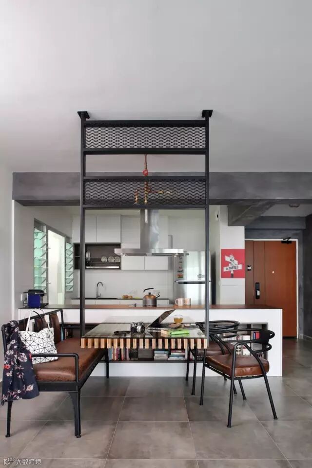 悬挑着餐桌上方通过金属方管于天花固定,形成一个自然的屏风,让这个区域可以兼作为书桌来使用。