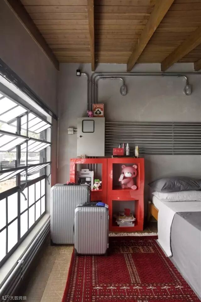 因为原有的多媒体装置在这个房间,所以整排的金属管就成了卧室的背景墙。
