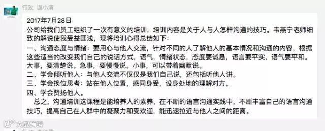 韦院长举了一个简单的例子 :“今天XX门店电脑坏了,下午你记得去修一下”和“今天XX门店电脑坏了,下午太阳也挺大的,你看什么时候方便去修一下,如果到时处理不了的话你就跟我说一声,我再想怎么跟他们沟通”对比有感情和无感情两种不同的沟通效果,强调了情感沟通的重要性,调动了大家学习的积极性。