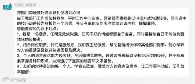 说到换位思考,韦宁燕院长强调——后台工作员工应当正确角色定位,加盟商作为内部客户应当竭尽全力给予帮助,跨部门员工是同事更是小伙伴更应相互理解,而在一线残酷市场拼搏的经纪人作为我们的家人更应给予最大的包容!