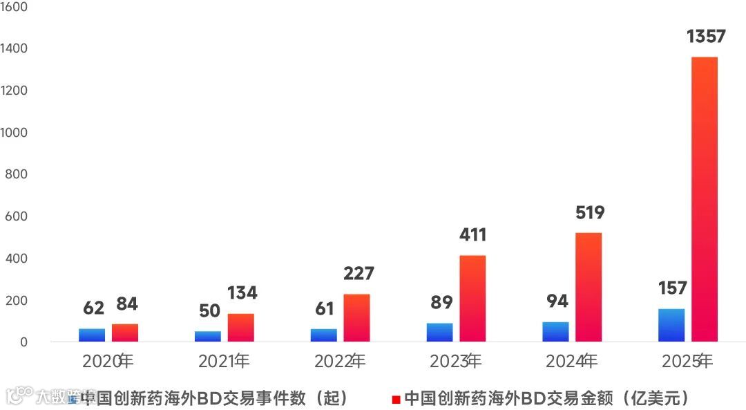 中国创新药的全球价值正在被加速重估。中银证券统计显示,2025年中国创新药共完成157起BD(商务拓展)出海授权交易,交易总额达1356.55亿美元,同比增长161%,展现出惊人的爆发力。
