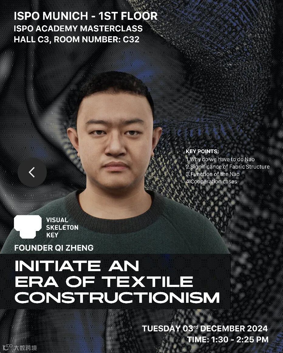 在展会期间,NAO创始人郑琦先生于12月3日应ISPO Academy Masterclass之邀,发表了一场引人入胜的演讲;郑琦先生在Masterclass中,展示了NAO的研发背景、历史与近期项目,并演示了大圆机针织、梭织和提花功能在内的软件操作。自2019年以来,NAO凭借其行业首创的软件,为针织创新增添了新的维度。该软件专注于开发圆机针织面料结构,支持在短时间内创建全新面料结构,并确保其能够实际生产。