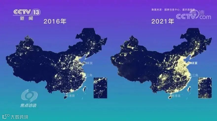 △5年间,中国经济体量稳步增长,而体现经济活跃度的灯光带,向着粤港澳大湾区、长三角、京津冀等几个区域集中呈明显特点。(国家信息中心供图)