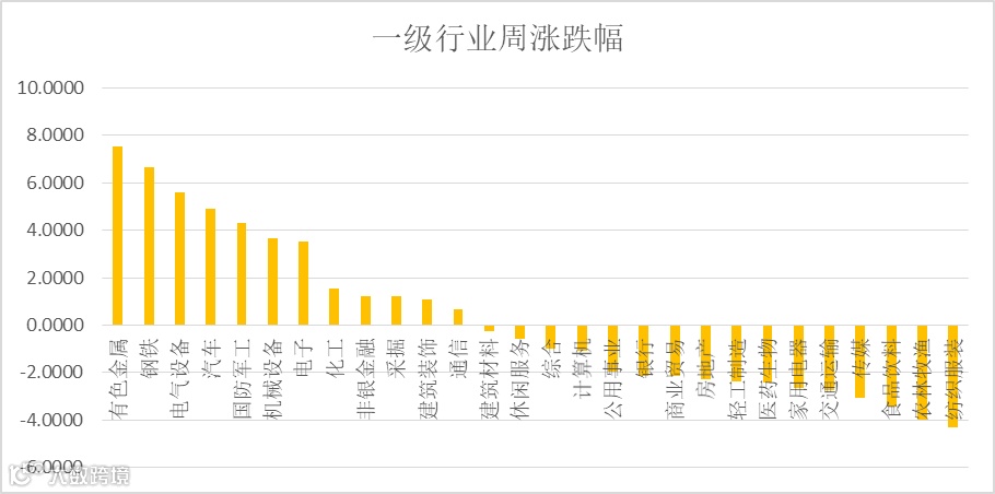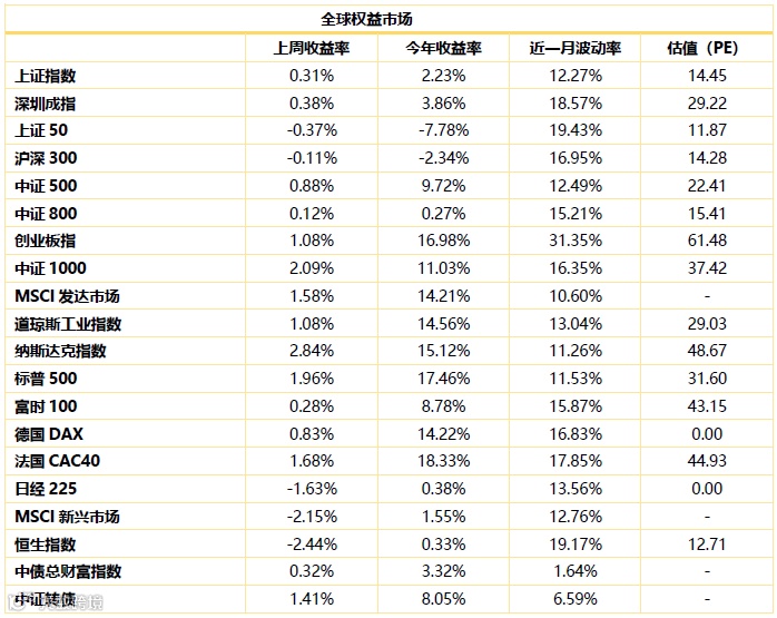 全球市场观察。上周欧美主要经济体股市普遍上涨,美国纳斯达克上涨2.84%,标普500上涨1.96%。德国DAX上涨0.83%、法国CAC40上涨1.68%,富时100上涨0.28%。亚洲市场普遍下跌,日本日经225指下跌1.63%,香港恒生指数下跌2.44%。