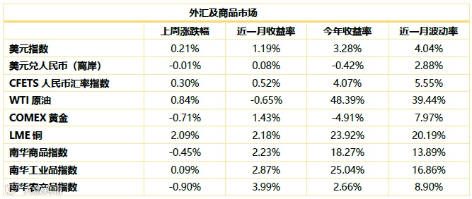 商品市场综述:上周商品市场呈震荡趋势。南华商品指数下跌0.45%,南华工业品指数上涨0.09%,南华农产品指数下跌0.90%。WTI原油上涨0.84%,COMEX黄金下跌0.71%,LME铜上涨2.09%。